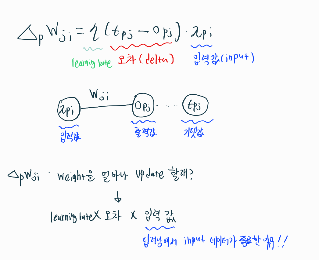 이 Rule은 참 단순하다. Weight의 변화량을 결정하는데 정답과 출력값이 많이 틀리면 많이 Weight을 업데이트하고, 적게 틀리면 적게 Weight을 업데이트하는 것이다. 즉, 오차에 비례하여 Weight를 업데이트한다.