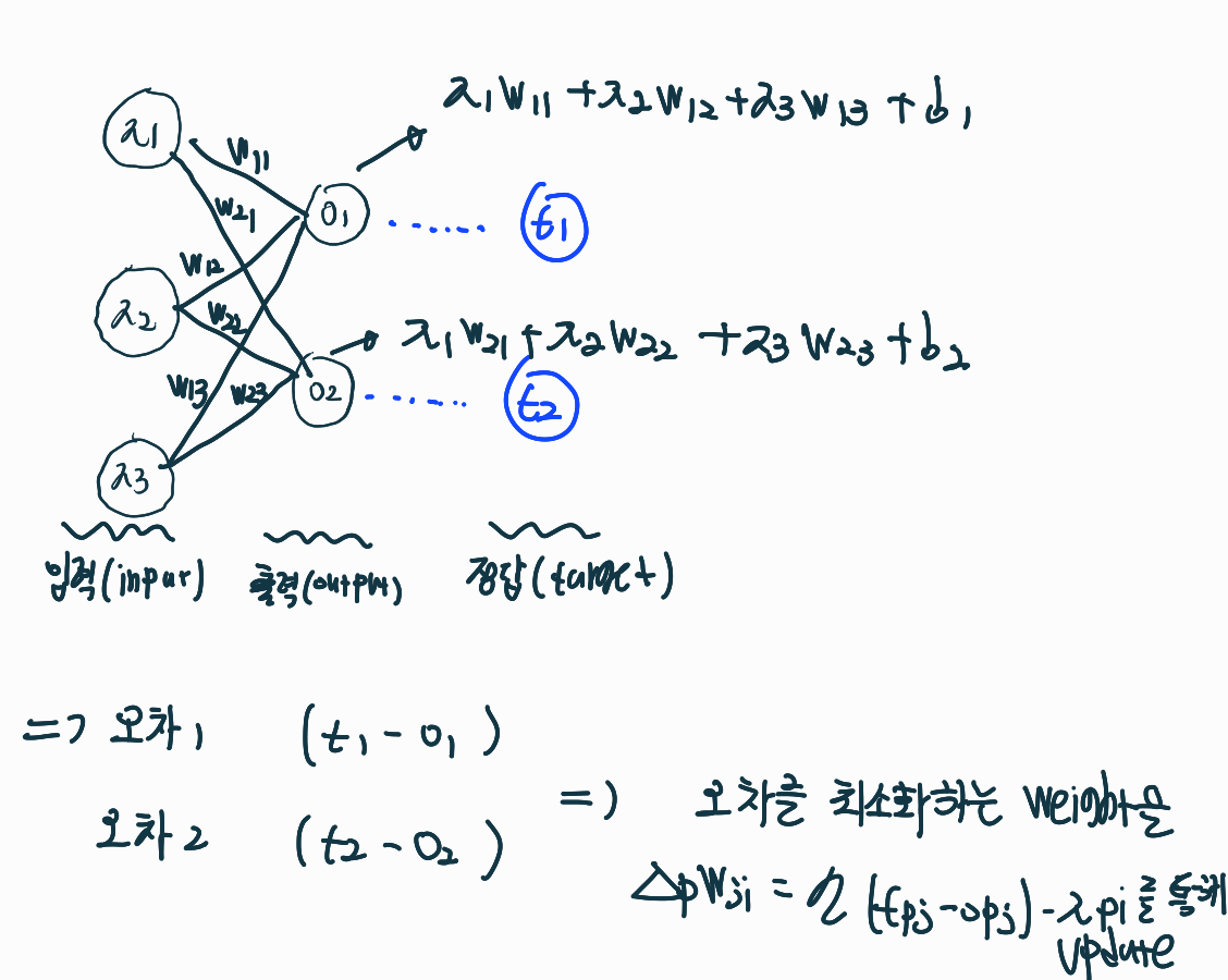아래 그림에서 O1,O2은 각 Input 데이터에 Weight 가중치를 곱하고 Bias를 더한 값이다. 그럼 실제 값(t1,t2)와의 차이인 오차를 구할 수 있을 것이고, 이 오차를 최소화하는 Weight 값을 업데이트 할 수 있을 것이다.