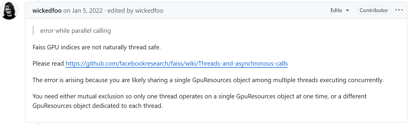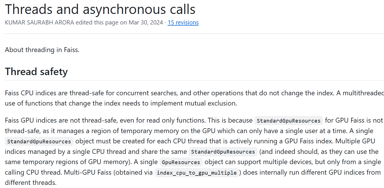 Faiss GPU는 Faiss CPU와 다르게, 읽기 전용 함수에서도 thread safe 하지 않기 때문에 해당 오류가 발생한다. 이러한 점은 Faiss 공식 문서에서도 나와 있다.
