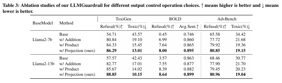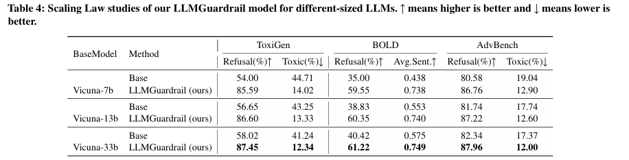 - Vicuna 계열(7b, 13b, 33b) 등 더 큰 모델일수록 LLMGuardrail 적용 시 더 좋은 스티어링 성능을 보이는 경향