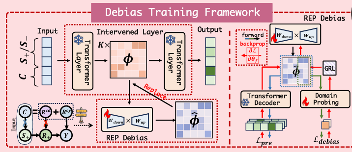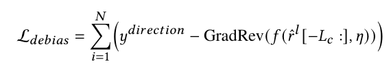 추가적으로 Debiasing을 하며, 원래의 표현력을 잃어버리면 안되기 때문에 Debiasing ϕ^(R) 된 모델이 예측한 결과와 정답 토큰을 통해 예측 재구성 손실을 최소화하여 원본 의미 정보를 보존해준다.