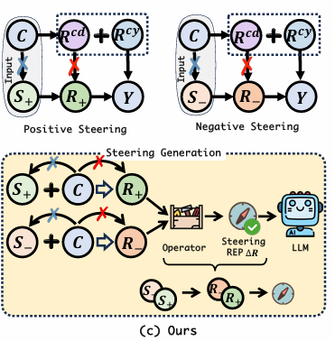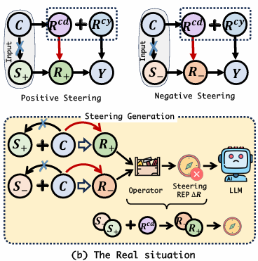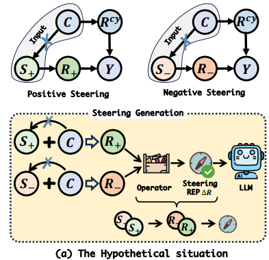 따라서 아래 그림과 같이 Confounder가 제어 프롬프트에서 생성되는 LLM의 표현에 미치는 영향을 제어하는 방식으로 steering vector를 얻어 LLM의 출력을 원하는 속성으로 유도하는 방법을 저자는 고려한 것이다.