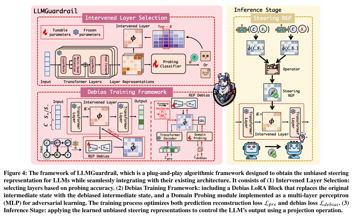 Top-K로 뽑은 레이어에 LoRA + Adversarial 방식을 통해 학습하여 편향을 제거한 Positive/Negative Prompt 차이 벡터(steering vector)를 추출하는 단계이다. 핵심 구성으로는 (1) Debias LoRA Block과 (2) Domain Probing module이 존재한다.